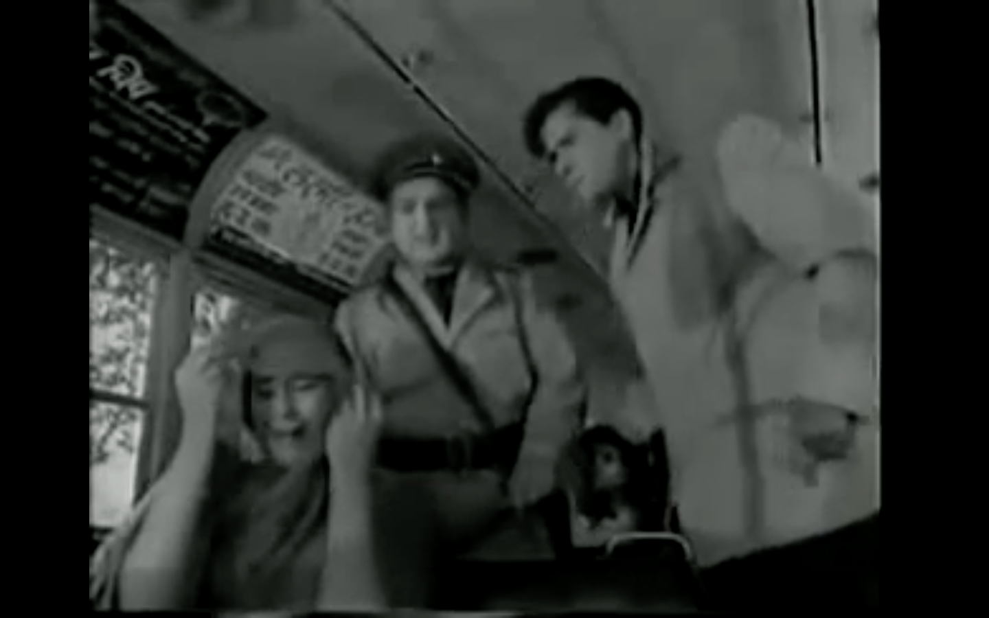 The cops stop the bus and Johnny Walker slimes off. Our hero then makes an appearance and pretends to be this lady’s hubby. Together they hoodwink the cops.